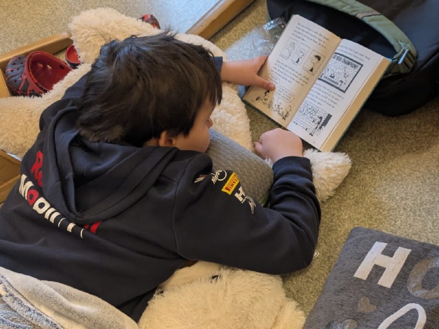 Besonders auffallend war die ruhige und konzentrierte Arbeitsatmosphäre. Die Kinder durften ihre Leseplätze frei wählen - viele nutzten Decken, Polster oder Kuscheltiere und lasen am Boden oder in kleinen Rückzugsbereichen. Dadurch entstand eine entspannte, aber zugleich sehr fokussierte Leseatmosphäre.